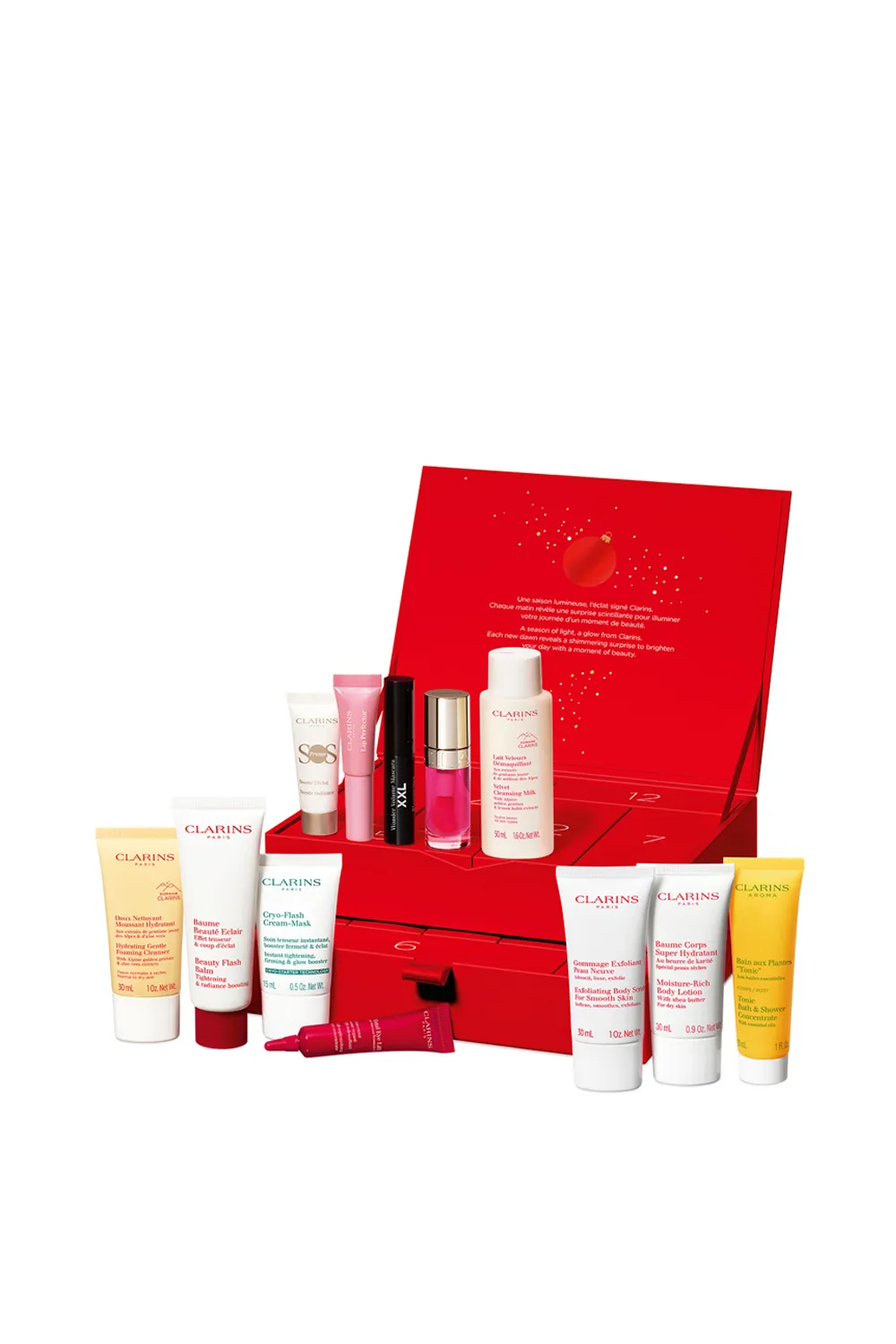 12-Day Advent Calendar, featuring some of Clarins’ most iconic and beloved products.