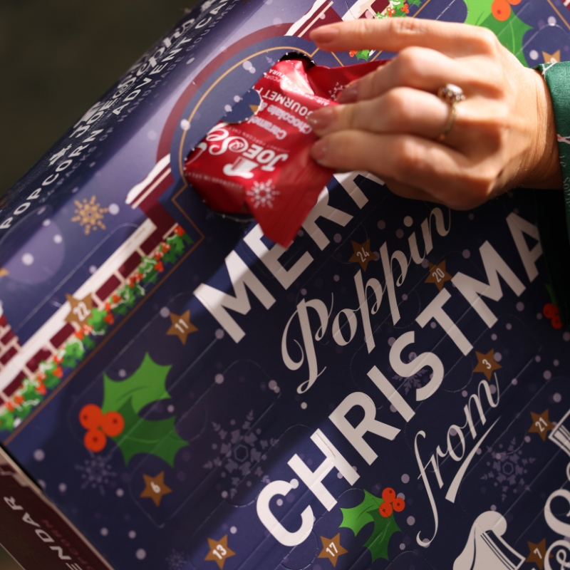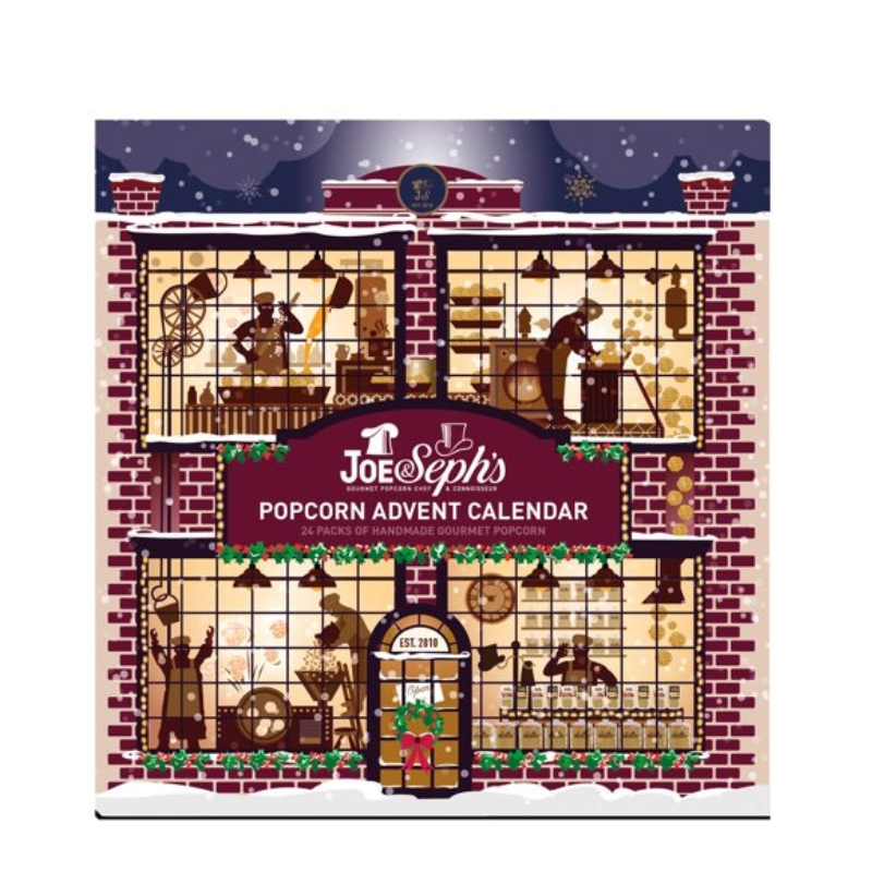 Our whimsical Advent Calendar opens up like a giant Christmas storybook and depicts a snowy scene of Joe’s Popcorn Kitchens at Christmastime. It’s certainly our most magical Advent Calendar yet.