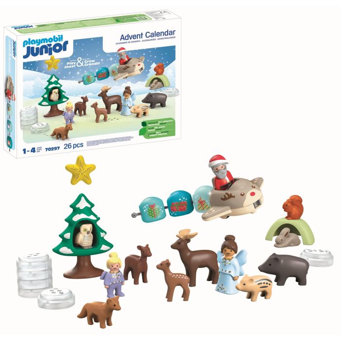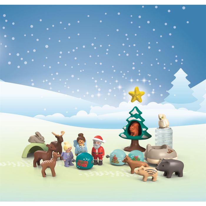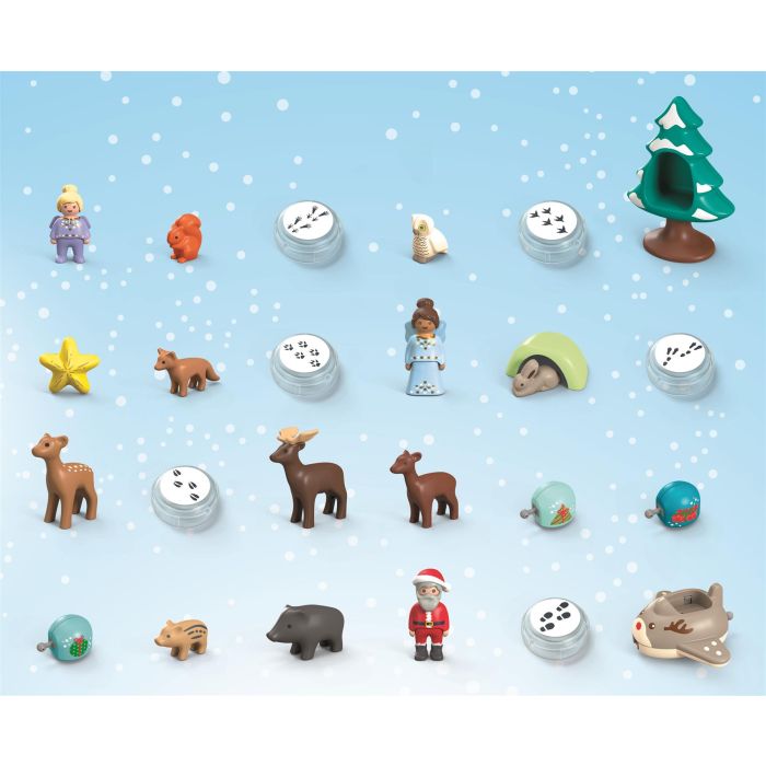 Reindeer airplane with three elements for attaching and combining. Six stackable footprint stones with control image on the underside. Nine forest animals. Fir tree with hiding place. Star with spinning function. Two angels and one Santa Claus designed for our youngest Playmobil fan
