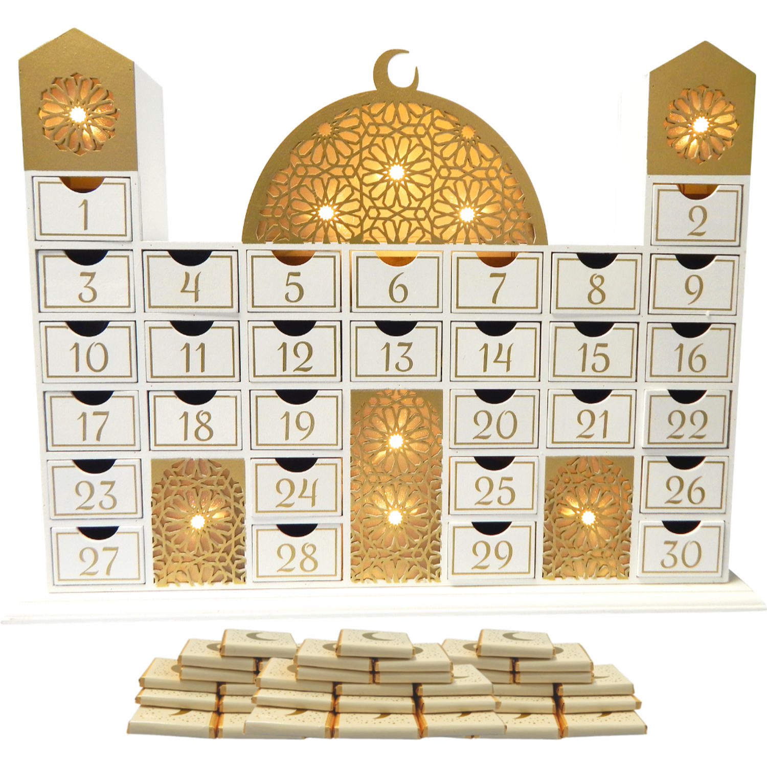Engage and celebrate Ramadan with our beautifully crafted Wooden Countdown Calendar, designed to delight and inspire the little ones throughout this special month. Chocolate Treats: Includes 30 creamy chocolates to sweeten each day of Ramadan. Dimensions: Size of 50x37x7 cm offers ample space and visual appeal for your home. Handcrafted Quality: Each calendar is lovingly handmade, ensuring unique craftsmanship. LED Lights: Battery powered LED lights add a warm glow (batteries not included). Copyrighted Design: Registered with the UK’s Intellectual Property Office (IPO), ensuring authenticity and originality. Vegetarian Friendly: Suitable for vegetarians, with ingredients clearly listed for peace of mind. Embrace the spirit of Ramadan with this delightful countdown calendar, perfect for families looking to add joy and tradition to their celebrations. Ideal as a gift or for personal use, it combines functionality with festive charm.