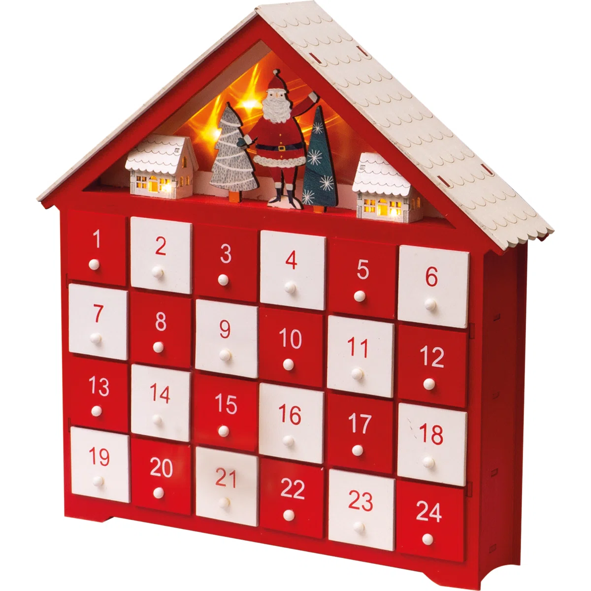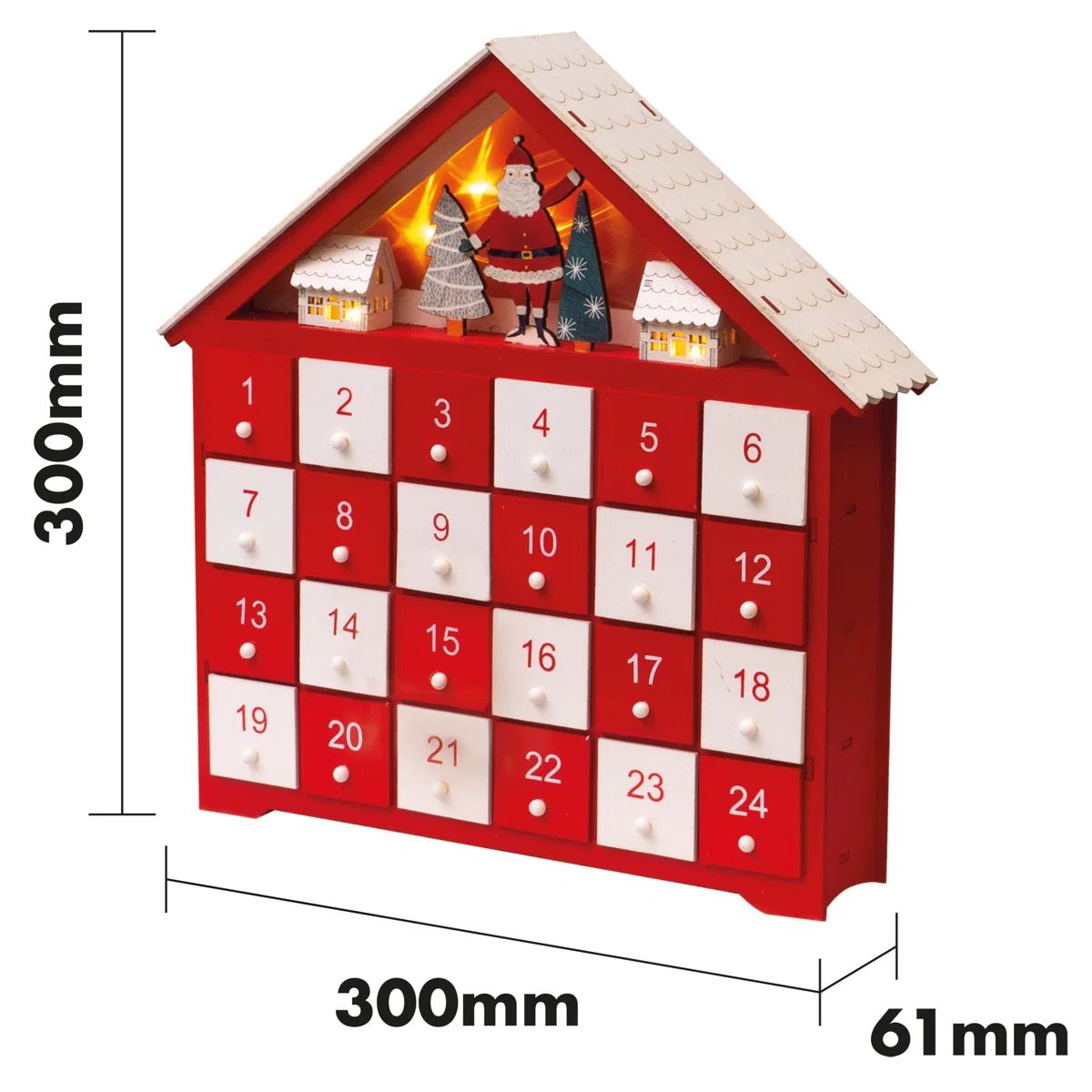 This beautiful advent calendar has a lovely old fashioned feel to it thanks to its wooden construction and the traditional festive red and white colours. The 24 individual drawers are large enough to hide sweets and surprises for your excited children to discover each day in the lead up to Christmas. The advent calendar is designed to look like a house with wooden carvings of Father Christmas, trees and houses under the peak roof. The advent calendar also has lights that shine through the small houses giving it a cosy feel when switched on at night. Requires 2x AA Batteries (not supplied).